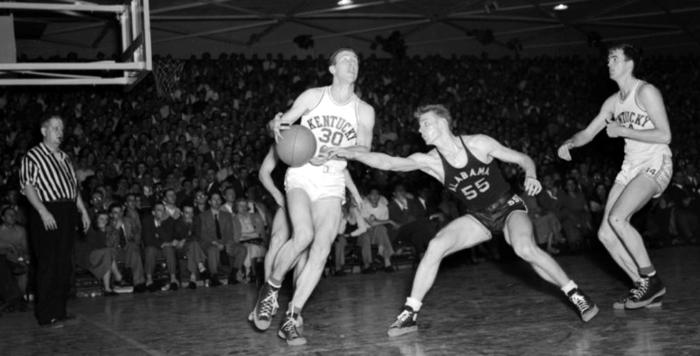 Ralph Beard (#12) drives to the hoop as Alabama's Hayden Riley defends