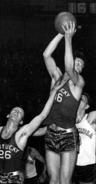 Alex Groza snares a rebound over teammate Ken Rollins (#26)