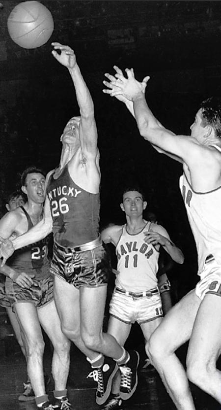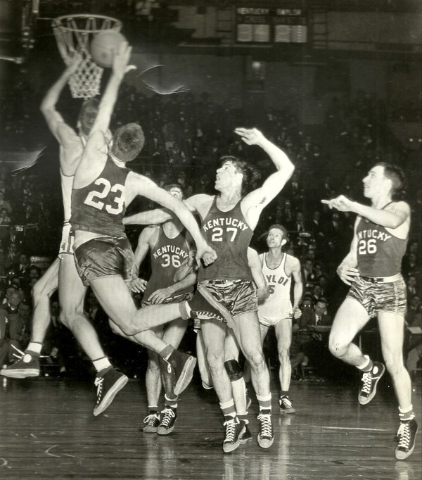 Baylor forward Bill DeWitt attempts a layup while trailed by Cliff Barker (#23) who fouled him. Looking on include Kentucky's Alex Groza (#36), Wallace Jones (#27), Ken Rollins (#26) and Baylor's James Owen (#5)