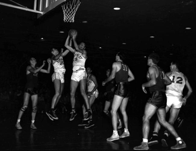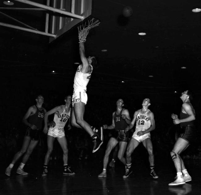 Wallace Jones (#27) leaps while Tulsa's Norman Ryer (#26), UK's Dale Barnstable (#18), Tulsa's Gale Welch (#31) and UK's Ralph Beard (#12) look on