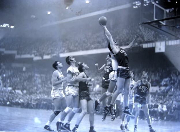 George Kaftan and Frank Oftring (#20) fight Kentucky's Alex Groza for a rebound, while Wallace Jones (#27) looks on