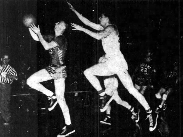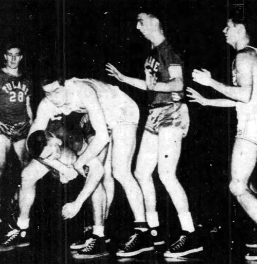 Alex Groza looks to to score while defended by Tulane's Jim Riffey. Dale Barnstable (#18) is seen in the background