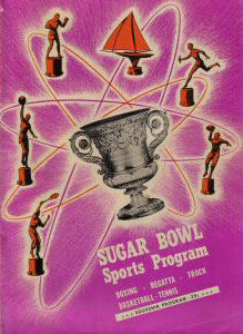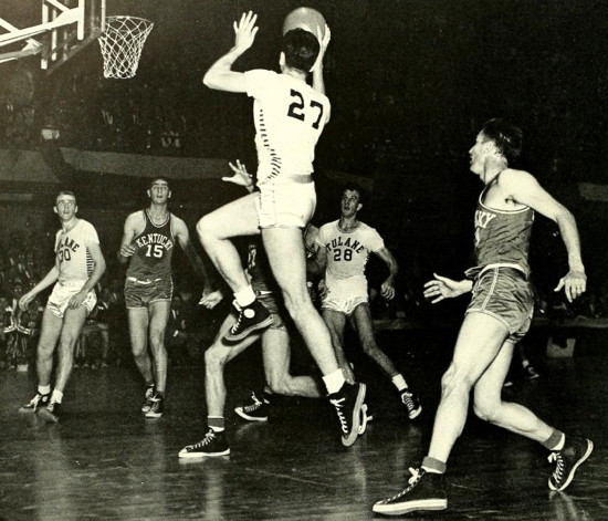 Alex Groza tries to score over Tulane's Jim Riffey (#30) while Wallace Jones (#27) and Tulane's Mel Peyton (#25) look on.
