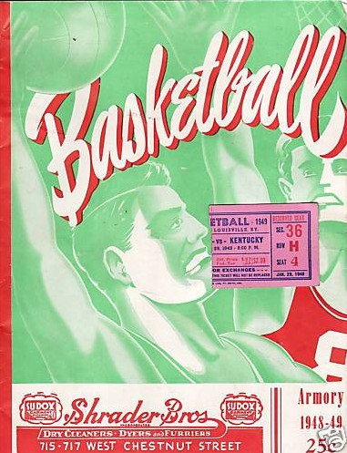 Notre Dame's Kevin O'Shea is swarmed for the ball by Alex Groza (#15) and Ralph Beard (#12). Looking on are Notre Dame's John Foley (#10) and Walter Hirsch (#19(