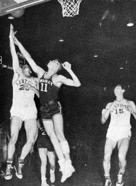 Ralph Beard drives in for a layup in front of Bradley's Paul Unruh (#15) while Bradley's Bill Mann and UK's Alex Groza and Wallace Jones look on