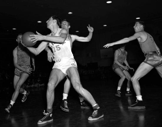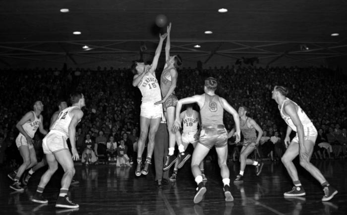 Alex Groza (#15) tips off against Vanderbilt's Pete Robinson in the final UK game held in Alumni Gym. Also shown are Ralph Beard (#12), Cliff Barker (far left), Wallace Jones (far right) and Dale Barnstable (#18). Also shown are Vanderbilt's Billy Joe Adcock (#9) and Hank Duvier (#3)