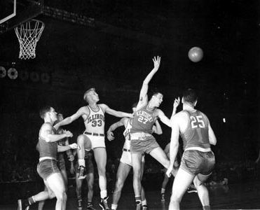 Wallace Jones (#27) tips the ball as Ralph Beard and Jim Line (#25) look on