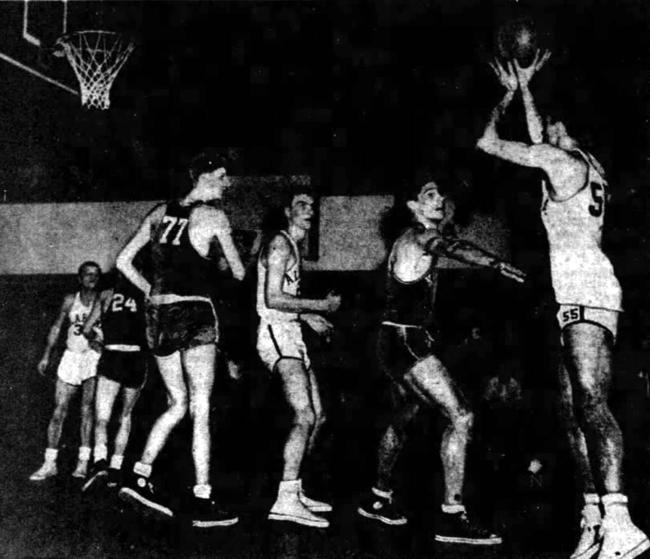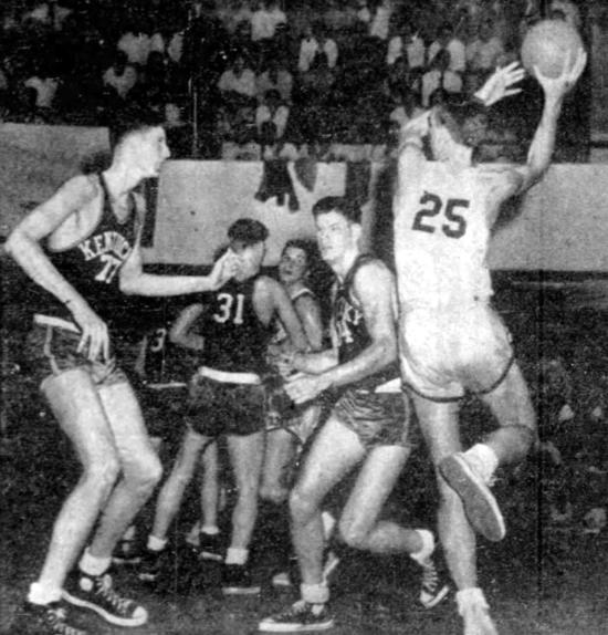 Alabama's Paul Sullivan (#25) attempts a hook in front of Bill Spivey (#77). Also shown are Jim Line (#34) and Len Pearson (#31)