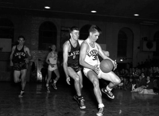 Xavier's Art Morthorst reaches in trying to steal ball away from Jim Line (#25)