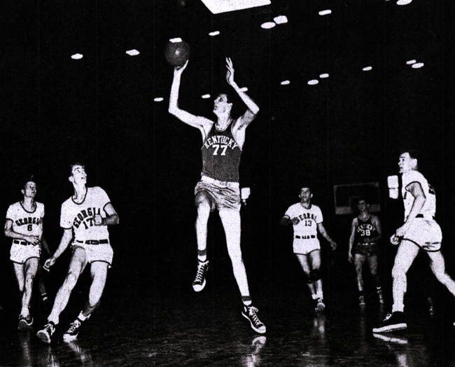 Bill Spivey (#77) launches a hook shot over Georgia's 6-9 center Bob Schloss while Georgia's Earl Davis (#12) looks on
