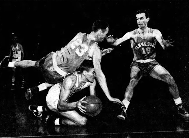 Shelby Linville is fouled while on the ground by Tennessee's Hank Kinzell (#23) while UT's Bert Keenan (#16) comes to assist. Looking on in the background is Dale Barnstable (#18)