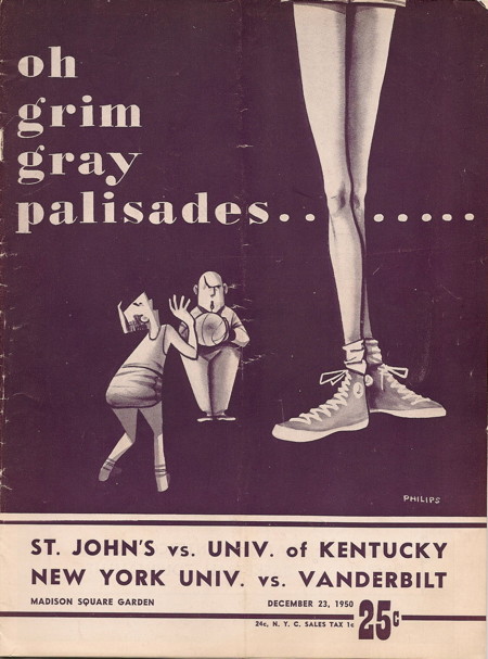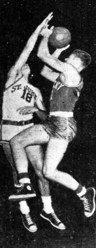 Frank Ramsey is fouled while shooting by St. Johns' Al McGuire (#18)