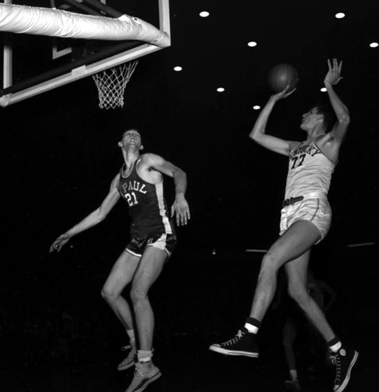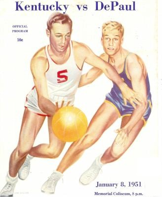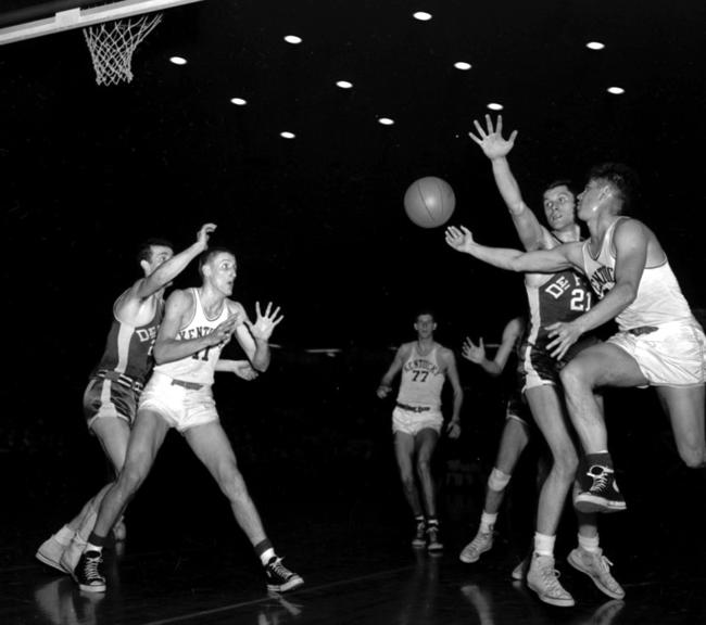 An unknown UK player tries to pass off the Shelby Linville (#11) under the basket while Bill Spivey (#77) trails the play