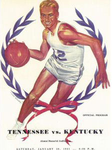 UT's Tommy Bartlett (#13) drives to the hoop in front of Bobby Watson (#38) and Frank Ramsey (#30)