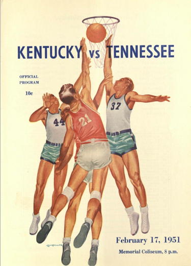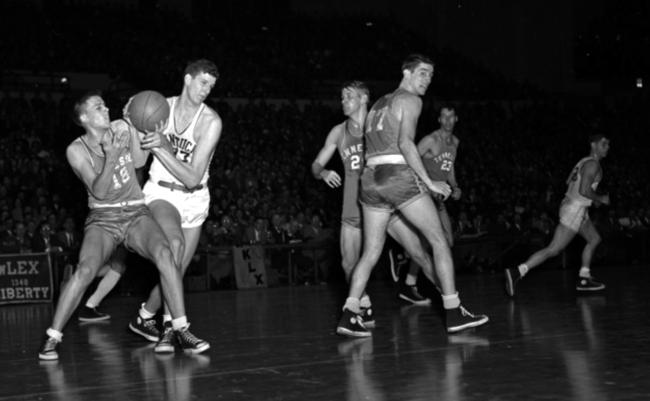 Tennessee's Bob Garrison (#24) fouls UK's Lucian (Skippy) Whitaker (#32). Looking on are Vol Doug Atkins and Kentucky's Bill Spivey (#77)