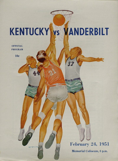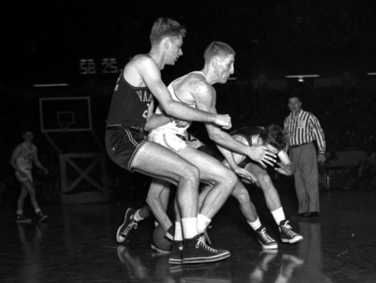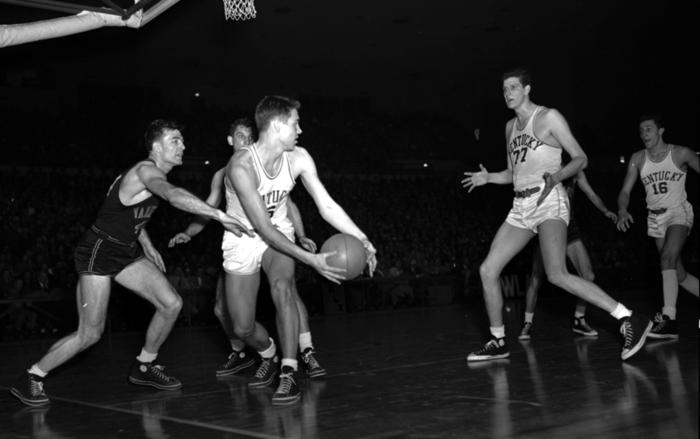 Cliff Hagan (#6) looks to pass to Bill Spivey (#77) while Lou Tsioropoulos (#16) trails. Defending Hagan for Vanderbilt is George Kelley and another unidentified player