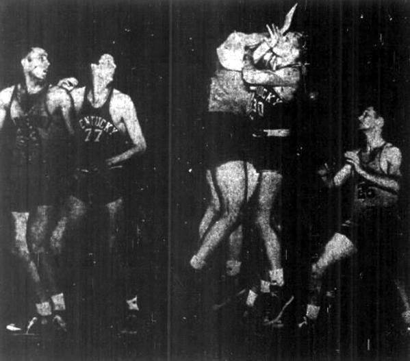 Vanderbilt's George Kelly and UK's Frank Ramsey (#30) collide at mid-floor. Looking on are Vanderbilt's Al Weiss (#43), UK's Bill Spivey (#77) and to right Vanderbilt's Jack Heldman (#25)