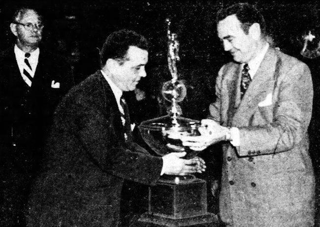 Vanderbilt Coach Bob Polk accepts the SEC Tournament Trophy from Kentucky Governor Lawrence Wetherby as Bernie Shively looks on