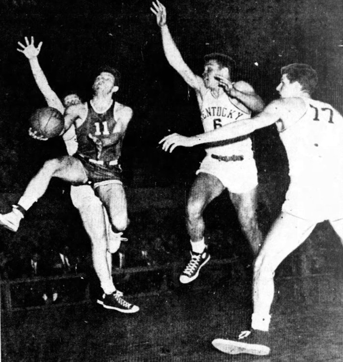 Louisville's Bob Naber (#11) shoots while defended by Cliff Hagan (#6), Bill Spivey (#77) and another unidentified Wildcat