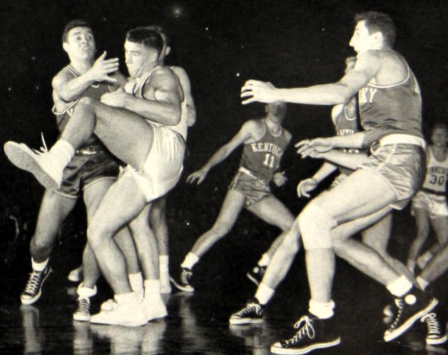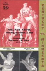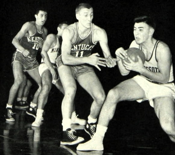 Frank Ramsey gets sandwiched between Minnesota's Dick Means (#11) and Gelle while UK's Lou Tsioropoulos (#16) and Shelby Linville look on in the background