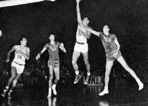 Cliff Hagan scores in front of LSU's Bob Pettit