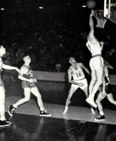 A Georgia Tech player flies into score while Bobby Watson contests and Lou Tsioropoulos looks on