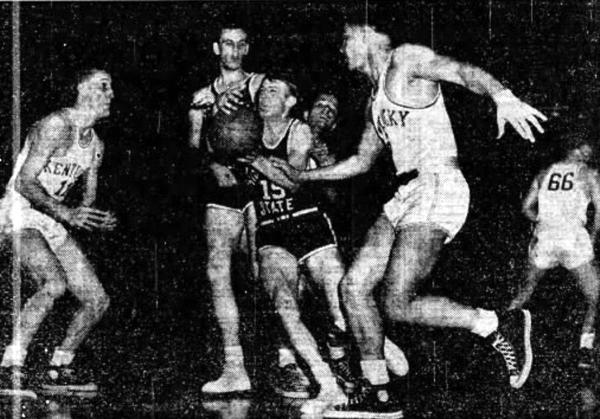 Mississippi State's Billy Owens (#15) is fouled on the arm by Cliff Hagan while Shelby Linville and MSU's George Cooke look on