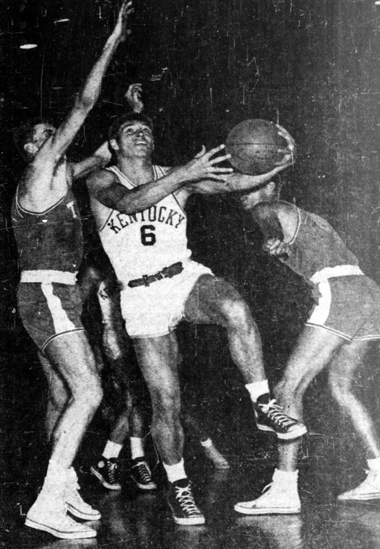Cliff Hagan (#6) shoots while defended by Georgia Tech's Bill Cline (left) and Pete Silas