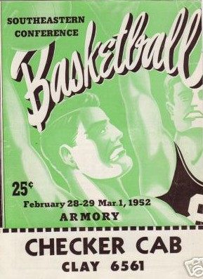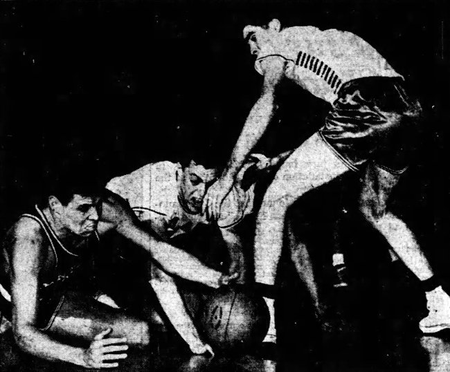 Cliff Hagan and Tulane's Don Holt are on the floor reaching for the ball