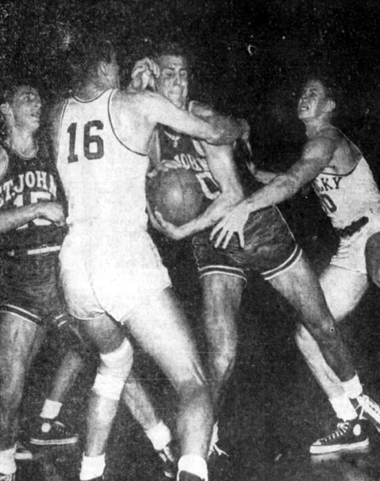St. Johns' Bob Zawoluk holds onto the ball while surrounded by Kentucky's Lou Tsioropoulos (#16) and Frank Ramsey (#30)