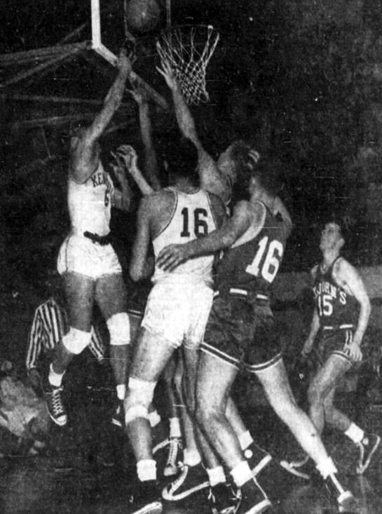 Cliff Hagan (#6) shoots from under the basket over the outstretched hands of St. John's defender Jim Davis while Lou Tsioropoulos (#16) and Dick Duckett (#16) and Ronnie MacGilvray (#15) look on