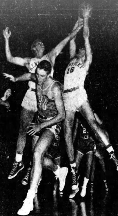 Cliff Hagan and Lou Tsioropoulos rebound over Georgia Tech's Dick Lenholt (#30)