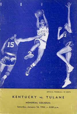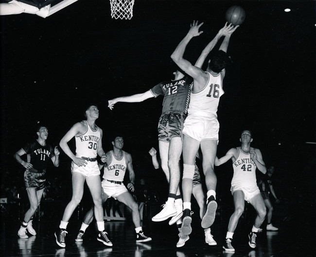 Lou Tsioropoulos (#16) fights for the ball with an unidentified Tulane player (#12) while Frank Ramsey (#30), Cliff Hagan (#6) and Bill Evans (#42) look on