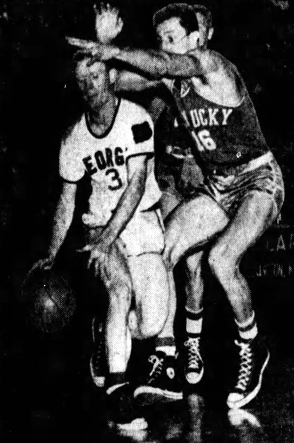 Cliff Hagan (#6) scores ahead of Georgia's Tom McManus (#4)