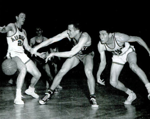 Auburn's Bill Fickling (#15) shoots over Kentucky's Lou Tsioropoulos while Jim Linville Puckett (#33), Bill Evans (#42) and Frank Ramsey (#30) look on