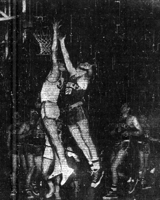 Auburn's Bob Miller scores inside ahead of Gayle Rose (#20)