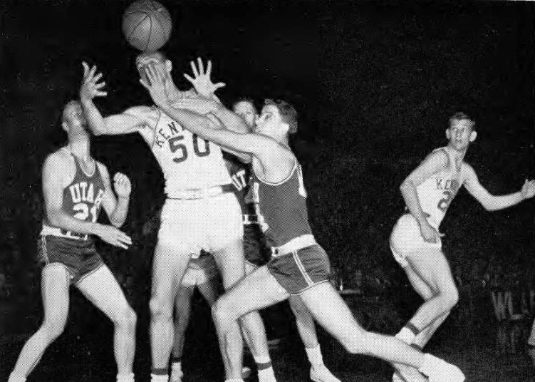 Jerry Bird (#22) lands amid Utah players De Lyle Condie (#4) and Art Bunte (#31) while Bob Burrow (#50), Phil Grawemeyer (#44) and Billy Evans (#42) look on