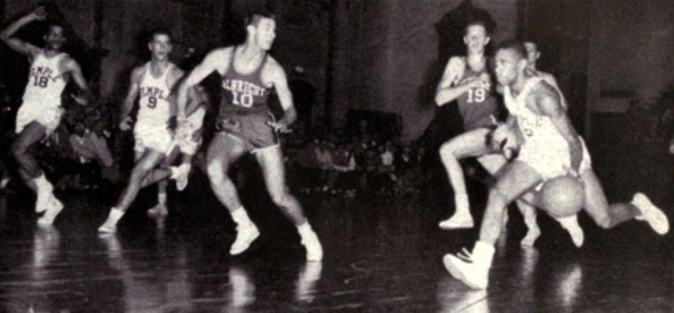 Temple's Hal Lear rushes down the court with the ball, as #10 tries to head him off