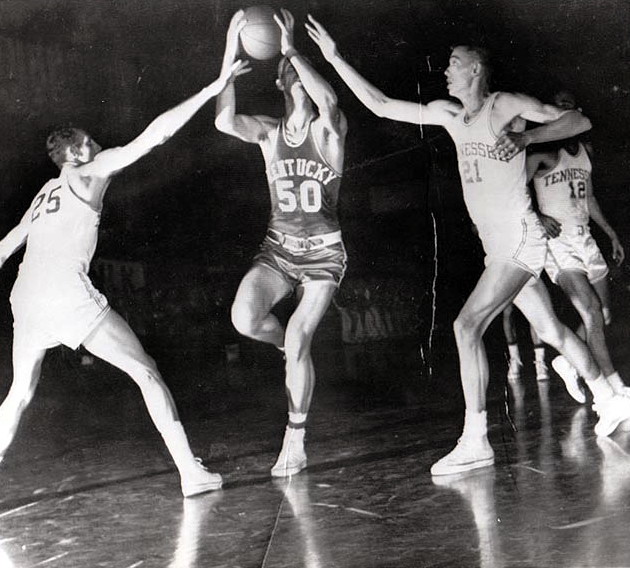 Burrow (#50) and Tennessee's Billy Mack fight for the loose ball while UK's Jerry Bird (#22) and Tennessee's Lewis Neyland and Carl Widseth look on