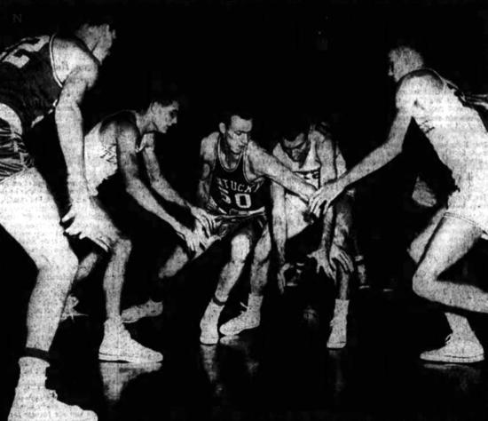 Tennessee's Dick Kellar and Carl Widseth try to stop Bob Burrow (#50) from getting off a shot