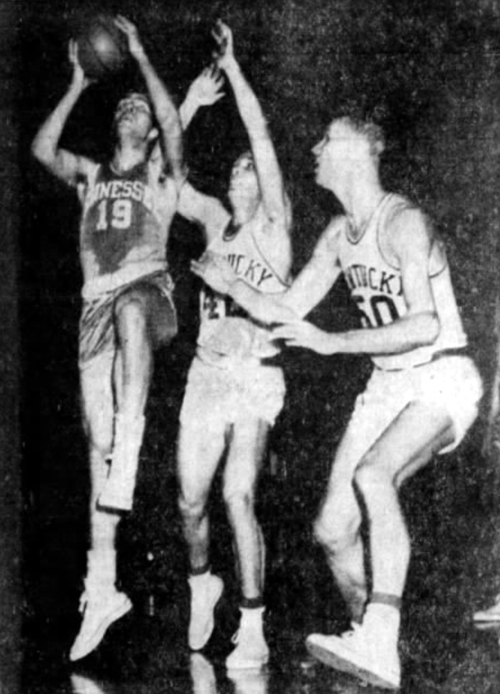 Kentucky's Jerry Bird (#22) grabs a rebound in front of Tennessee's Herman Thompson (#15) and Carl Widseth (#21)