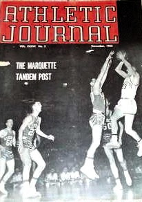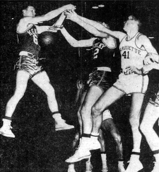 Kentucky's Gerry Calvert (#60) to left and Jerry Bird (#22) fight Marquette's Rube Schulz (#41) for the ball