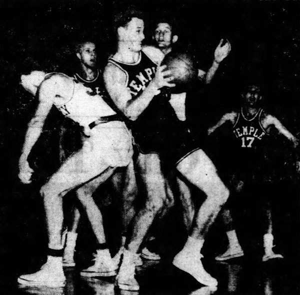 Temple's Tink Van Patton grabs a rebound. Behind him is Ed Beck. Temple's Hal Reinfeld (#17) looks on at the right