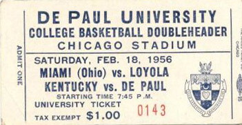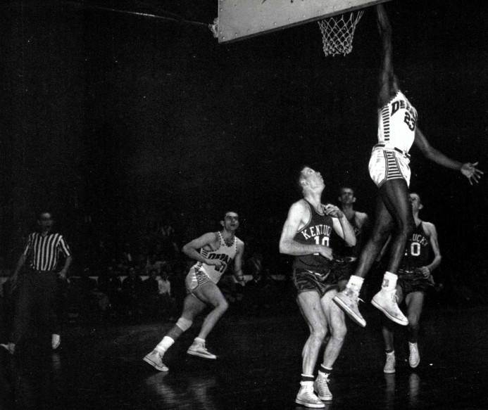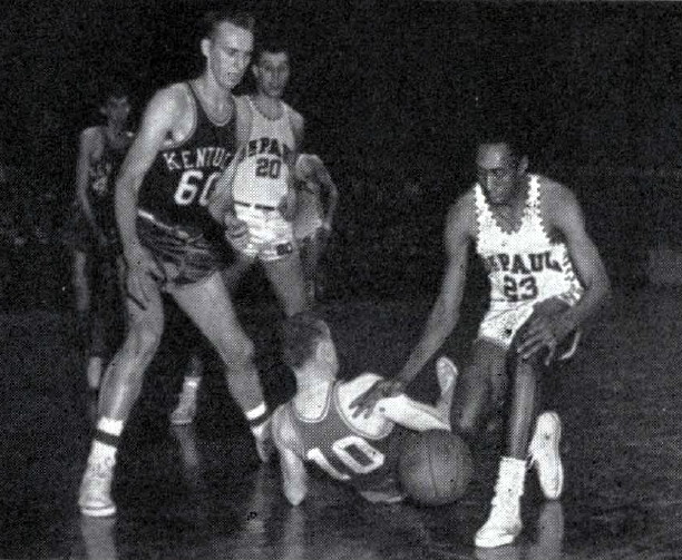 DePaul's senior guard Bill Robinzine (#23) dribbles past Gerry Calvert (#10) who fell to the ground while Bob Burrow (#60) tries to cut him off.
