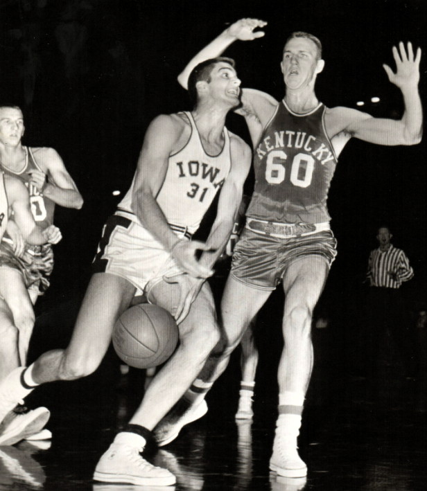 Bob Burrow (#60) shoots over the Iowa center while Vern Hatton (#40) and Phil Grawemeyer (#44) look on