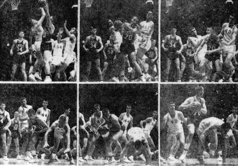 Action from the game. Kentucky's Johnny Brewer (#70) and Houston's Danny Dotson (#42) fight for a rebound, resulting in Houston's Russell Boone being knocked down inadvertently