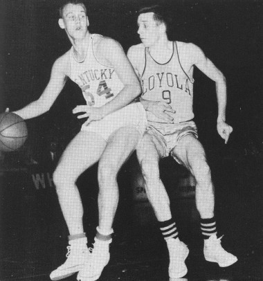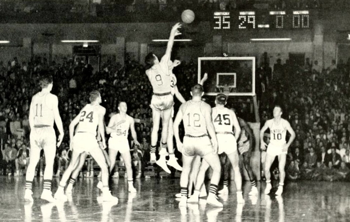 Ray Mills (#55) misses the rebound, but Ed Beck (#34) secures the ball