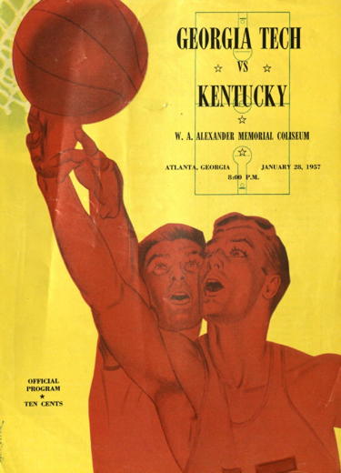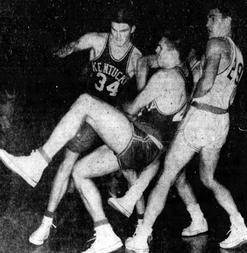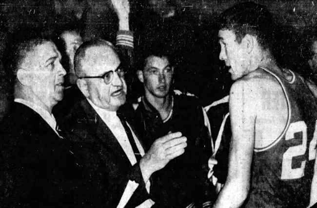 Adolph Rupp and assistant coach Harry Lancaster give instructions to UK star Johnny Cox (#24)