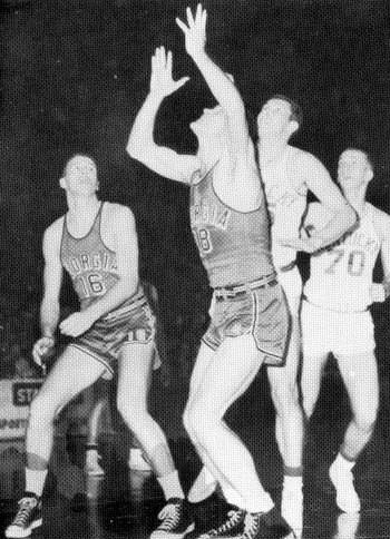 Ray Mills (#55) shoots while John Brewer (#70) angles for the rebound