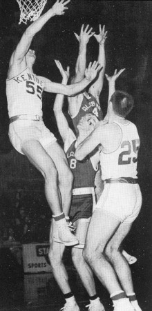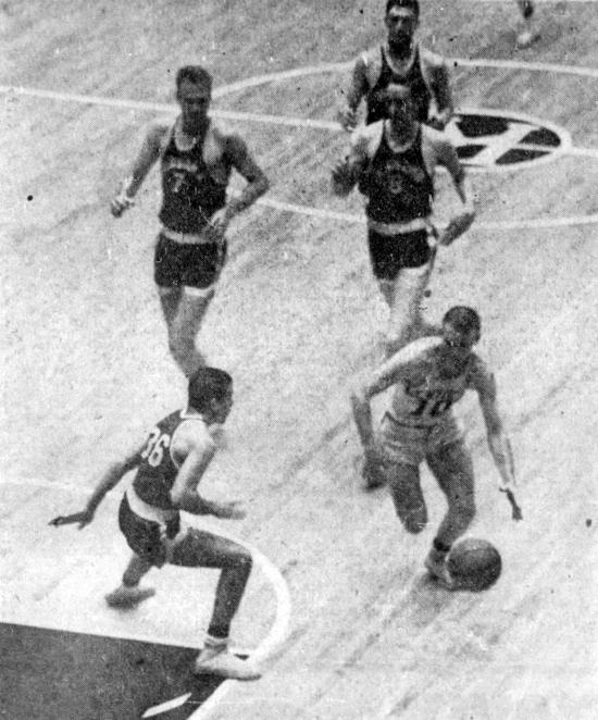 Gerry Calvert (#10) pushes the ball against Alabama defender Len Kaplan (#36). Also shown are Alabama's Jim Fulmer (#7), E.B. Hamner (#8) and James Bogan.
